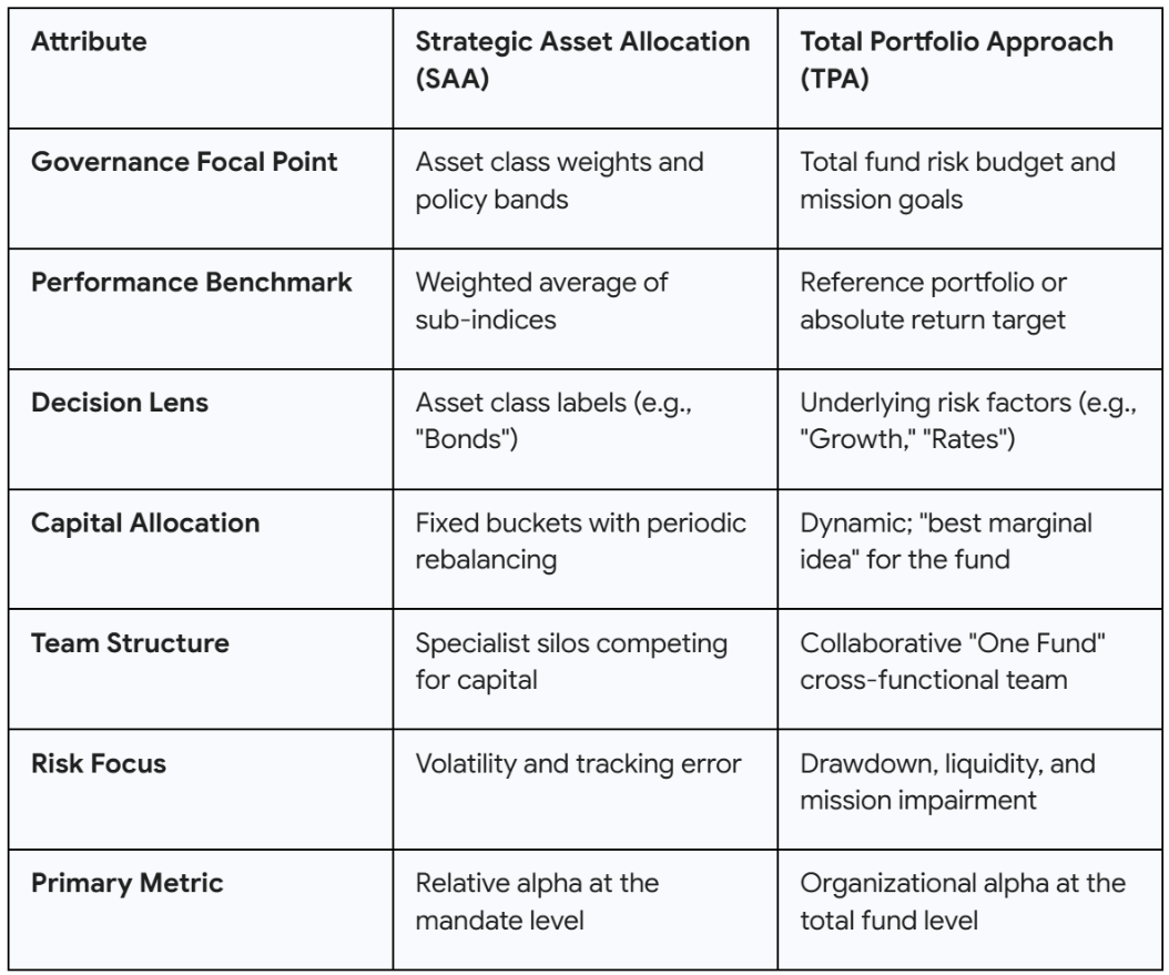 The TPA framework is characterized by a "competition for capital" where every investment opportunity - regardless of its label - must earn its place in the portfolio by improving the total mix's risk-return profile. This allows capital to flow to where the risk-adjusted returns are highest in real-time. For example, if private credit offers superior yield and risk characteristics compared to public equities, a TPA-oriented fund can shift capital into credit without being constrained by a 10% allocation cap set years ago by a board.