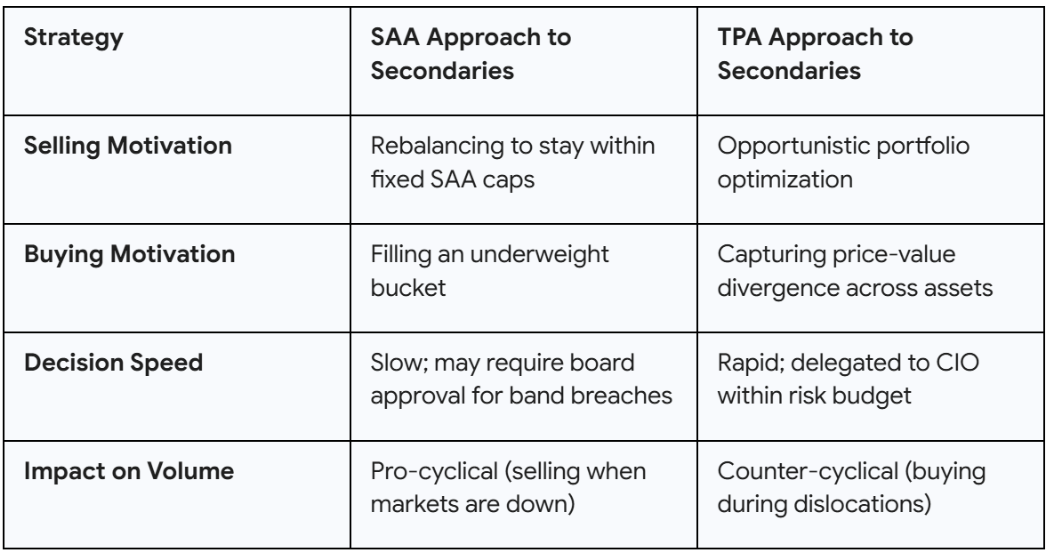 A TPA framework views illiquidity through a different lens. Instead of compliance bands, it focuses on "opportunity cost" and "total fund resilience". If public markets are selling off, the TPA manager recognizes that public equities may now offer a higher forward-looking risk-adjusted return than some private holdings. This allows the fund to act with agility - either by pausing commitments or by opportunistically buying secondaries - without being "handcuffed" to legacy targets.