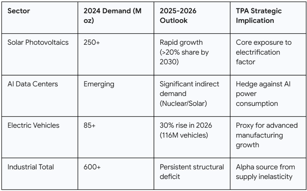 Silver provides an even more stark example of TPA’s tactical edge. Unlike gold, which is primarily a monetary asset, silver is a hybrid with massive industrial tailwinds. In 2025 and 2026, the silver market entered a regime of structural scarcity. Demand from the solar PV sector reached record levels, with solar panels consuming over 25% of annual global supply in 2024 and approximately 448 million ounces in the first half of 2025 alone.