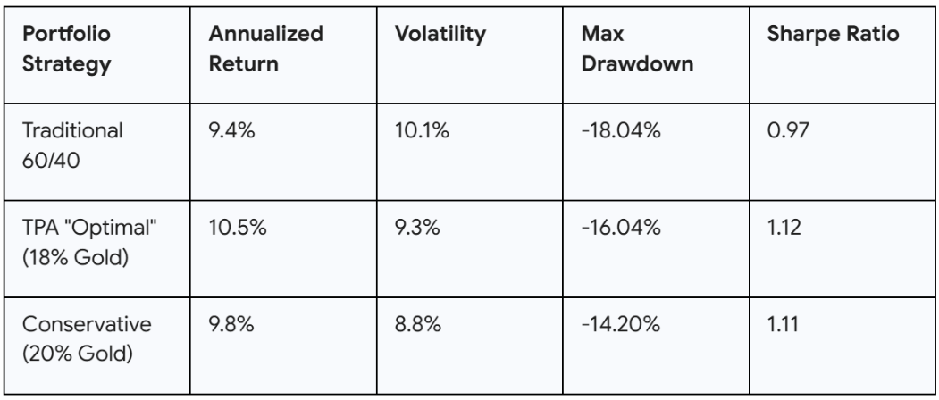 Academic and institutional research consistently points toward an "optimal" gold allocation that is significantly higher than what is found in most institutional portfolios. From 1973 to 2024, the Sharpe ratio of a traditional 60/40 portfolio was 0.97. However, an "optimal" portfolio that included an 18% allocation to gold increased the Sharpe ratio to 1.12 while simultaneously reducing the maximum drawdown.